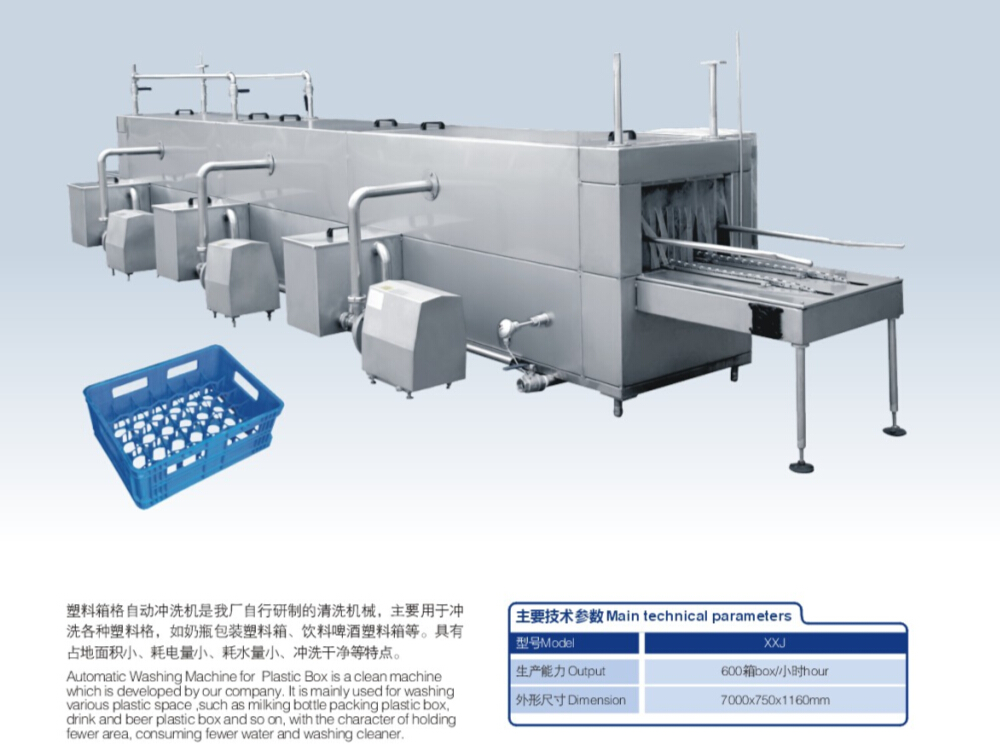 塑料箱格自動(dòng)沖洗機(jī)是我廠自行研制的清洗機(jī)械,主要用于沖洗各種塑料格,如奶瓶包裝塑料箱、飲料啤酒塑料箱等。具有占地面積小、耗電量小、耗水量小、沖洗干凈等特點(diǎn)。
